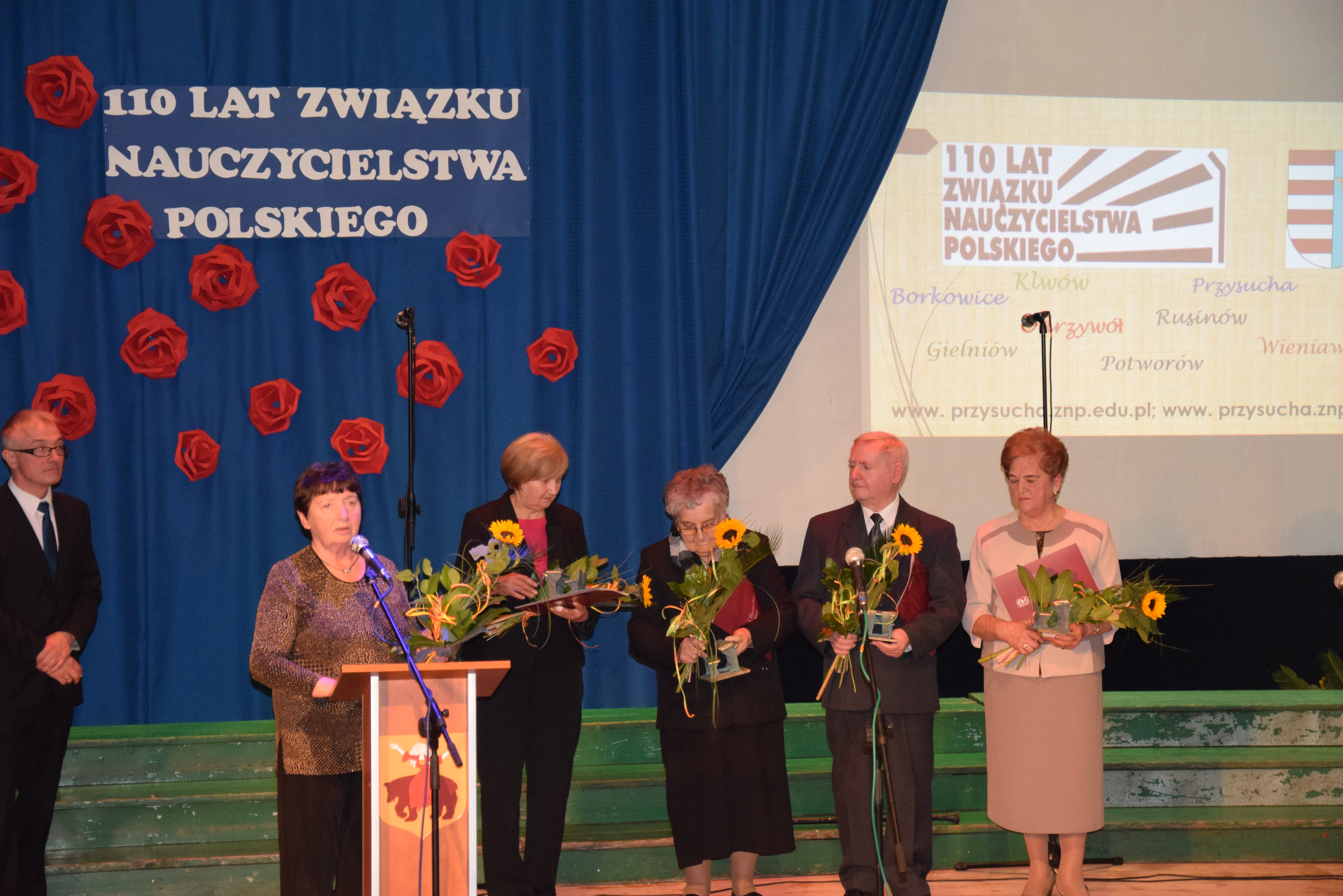 Zaproszonych gości powitał Kol. Robert Traczyk, Prezes Oddziału Powiatowego ZNP w Przysusze. Jubileusz swoją obecnością zaszczycili Kol. Dorota Kurzawa z Zarządu Głównego Związku Nauczycielstwa Polskiego, Pan Adam Pałgan Zastępca Burmistrza Gminy i Miasta Przysucha, przewodniczący Rady GiM Przysucha Pan Mirosław Pierzchała, Pan Krzysztof Sobczak Wójt Gminy Wieniawa, Pani Krystyna Żurowska wice wójt Gminy oraz przewodnicząca Rady Gminy Wieniawa Pani Grażyna Strzelczyk, przewodniczący Rady Gminy Borkowice Pan Tomasz Zdral. Władze powiatowe reprezentowali Pani Luiza Kozłowska kierująca wydziałem edukacji, kultury i promocji oraz Pan Marcin Niewczas przewodniczący Komisji Oświaty. Obecnością uroczystość również zaszczycili dyrektorzy szkół i placówek oświatowych z powiatu przysuskiego, związkowcy i pracownicy oświaty.